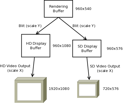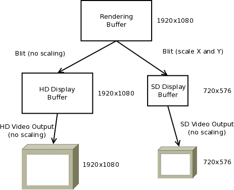 The display buffers in this scenario are using the same resolution horizontally as the rendering buffer since we take advantage of the video output horizontal scaling capabilities to avoid allocating larger buffers than necessary. This means that the display buffers must follow the vertical resolution of their respective display and the blitter will be used to scale vertically from rendering to display buffers.