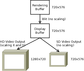 The display buffers in this scenario are using the same resolution vertically as the video output, i.e., only horizontal scaling is done with the video scaler of the HD output.