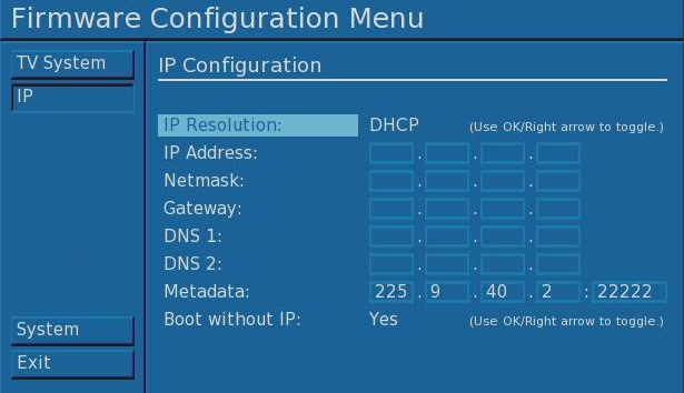 IP Resolution, choose DHCP or static IP by using the OK or arrow RIGHT button. If a static IP address is to be set, follow the instructions below: