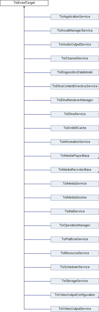 ToiApplicationService ToiAssetManagerService ToiAudioOutputService ToiChannelService ToiDiagnosticsDataModel ToiDlnaContentDirectoryService ToiDlnaRendererManager ToiDlnaService ToiDvbEitCache ToiInformationService ToiMediaPlayerBase ToiMediaRecorderBase ToiMediaService ToiMediaSession ToiNetService ToiOperationManager ToiPlatformService ToiResourceService ToiSchedulerService ToiStorageService ToiVideoOutputConfiguration ToiVideoOutputService