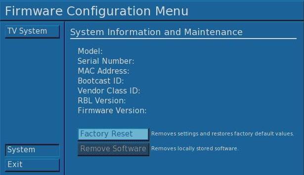 System information contains IP-STB's model, serial number, MAC address, bootcast ID, vendor class ID, RBL version and firmware version.