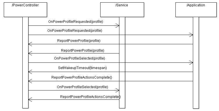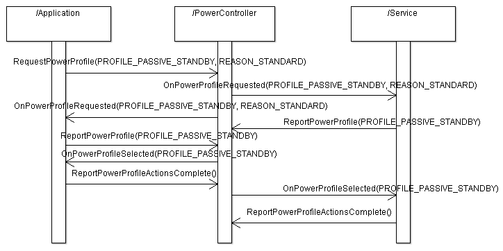 The last two interfaces implements the handshaking procedure, for more details. Please see the API Reference tab describes the API further.Access to the power management services is granted by creating a power control instance using the platform service interface. Applications are required to register for power control. Only in very, very rare cases can the application be excused. Subsequent actions are done through the power control and power control observer interface.